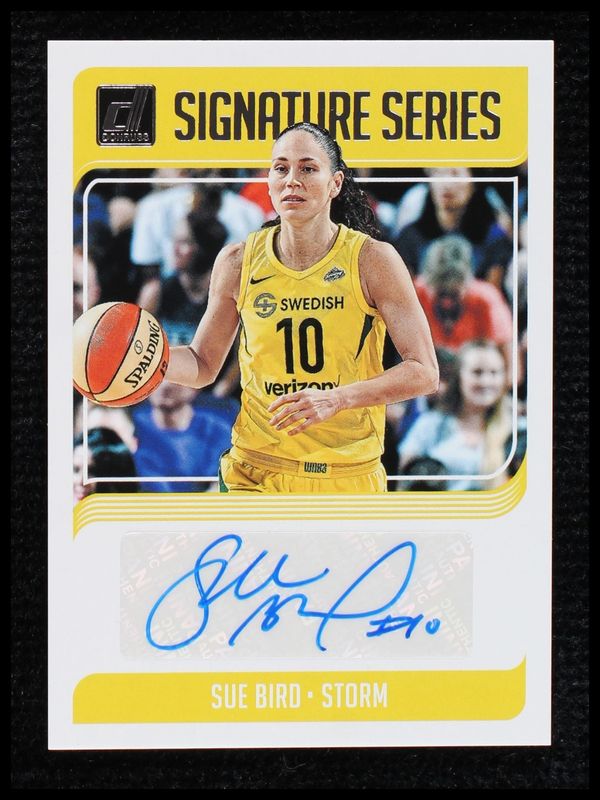 The Sue Bird 2019 Donruss WNBA #SS-SBD Signatures Series card is 1 of 29 Sue Bird's card variations in the 2019 Donruss WNBA set being tracked by Sports Card Investor, including Base, Optic, Optic Holo, Silver Press Proof /199, and Purple Press Proof /99.