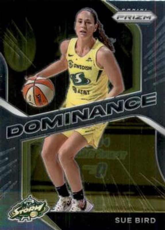 The Sue Bird 2021 Prizm WNBA #8 Dominance card is 1 of 72 Sue Bird's card variations in the 2021 Prizm WNBA set being tracked by Sports Card Investor, including Base, Green, Green Ice, Hyper, and Ice.