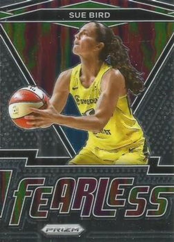 The Sue Bird 2021 Prizm WNBA #11 Fearless card is 1 of 72 Sue Bird's card variations in the 2021 Prizm WNBA set being tracked by Sports Card Investor, including Base, Green, Green Ice, Hyper, and Ice.