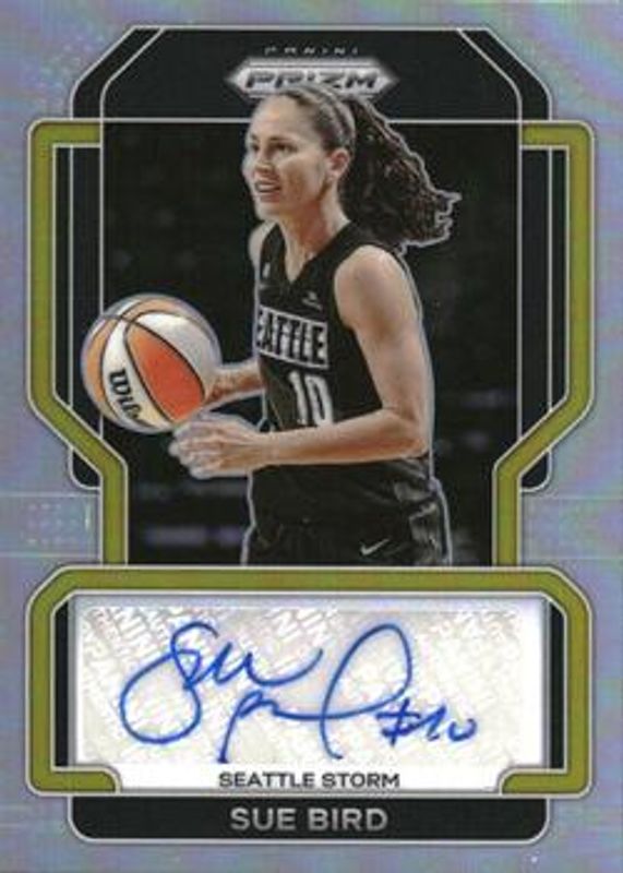 The Sue Bird 2022 Prizm WNBA #SG-SBD Signatures - Silver card is 1 of 94 Sue Bird's card variations in the 2022 Prizm WNBA set being tracked by Sports Card Investor, including #157 Base, #154 Base, #154 Green, #157 Green, and #154 Green Ice.