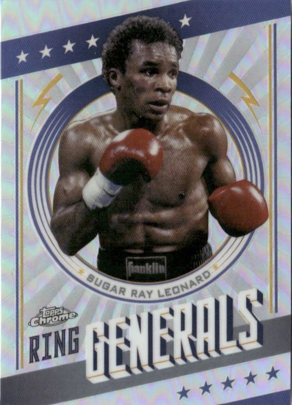 The Sugar Ray Leonard 2024 Topps Chrome #RG-1 Ring Generals card is 1 of 27 Sugar Ray Leonard's card variations in the 2024 Topps Chrome set being tracked by Sports Card Investor, including Base, Prism Refractor, Refractor, Bronze Refractor /225, and Aqua Refractor /199.