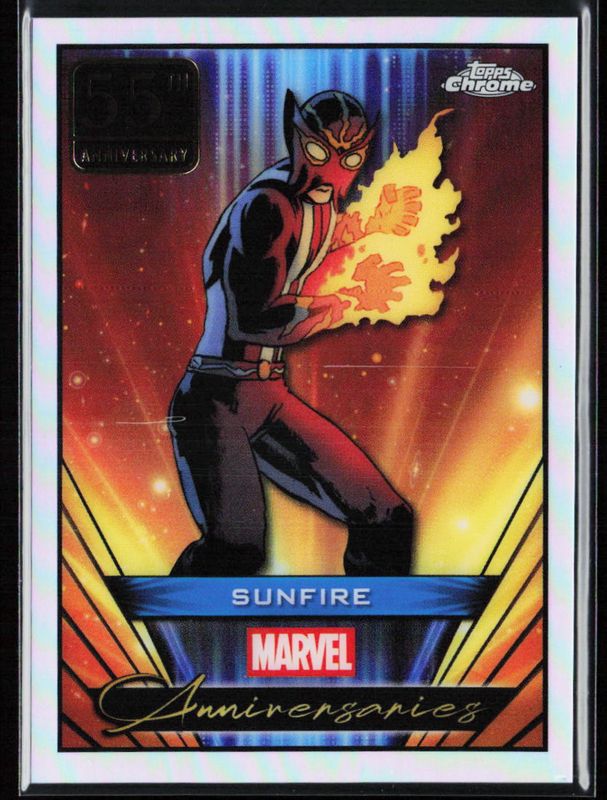 The Sunfire 2025 Topps Chrome #MA-10 Marvel Anniversaries card is 1 of 29 Sunfire's card variations in the 2025 Topps Chrome set being tracked by Sports Card Investor, including Base, Refractor, Yellow Lava Refractor, Spider Web Refractor /399, and Blue Refractor /299.
