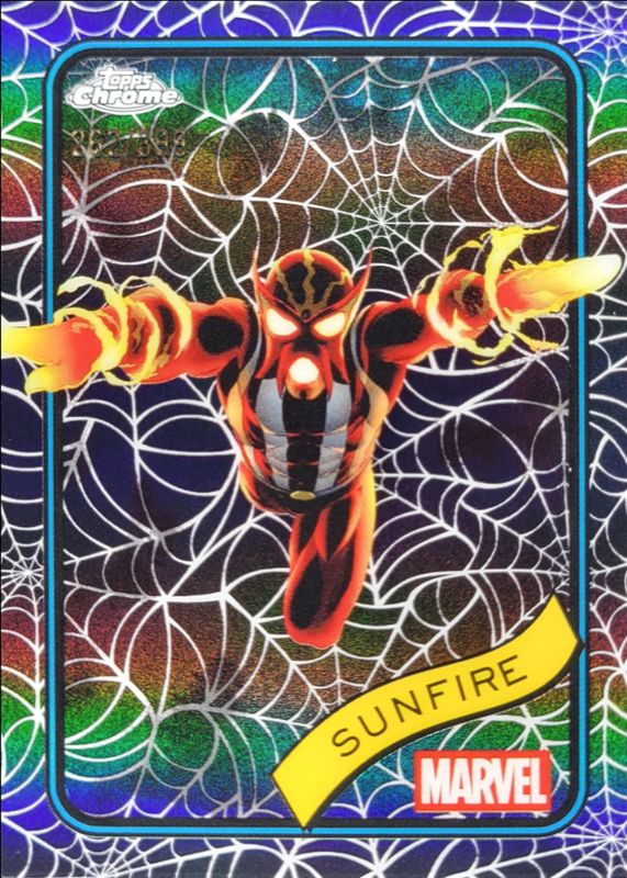 The Sunfire 2025 Topps Chrome #22 Spider Web Refractor /399 card is 1 of 29 Sunfire's card variations in the 2025 Topps Chrome set being tracked by Sports Card Investor, including Base, Refractor, Yellow Lava Refractor, Blue Refractor /299, and Blue & Green Shimmer Refractor /199.