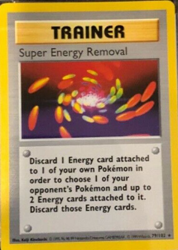 The Super Energy Removal 1999 Pokemon Game #79 Shadowless card in Raw TCG (Near Mint) condition has not changed in price in the last 30 days and was last sold for $2.50 .