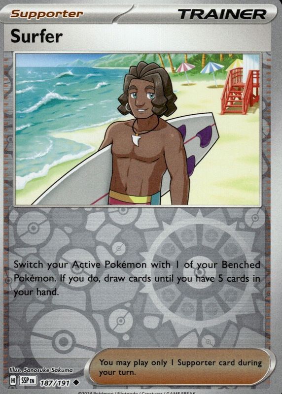 Pokemon Surging Sparks Surfer Reverse Holo Trainer Card 187/191 NM