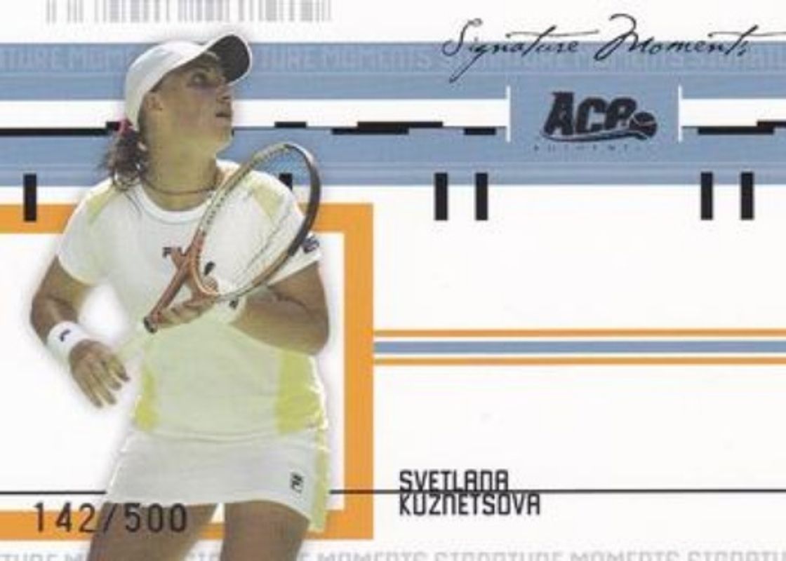 The Svetlana Kuznetsova 2005 Ace Authentic Signature Series #SM-9 Signatures Moments /500 card is 1 of 9 Svetlana Kuznetsova's card variations in the 2005 Ace Authentic Signature Series set being tracked by Sports Card Investor, including Base, Holofoil /100, Signatures Moments Autographs, Grand Slam Champions /500, and Grand Slam Champions Jersey /500.