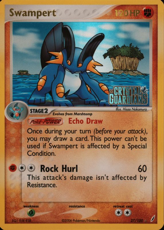The Swampert 2006 EX: Crystal Guardians #027/100 Base card in Raw TCG (Near Mint) condition has moved down -$1.18 (-34.4%) in the last 30 days and was last sold for $2.25 .