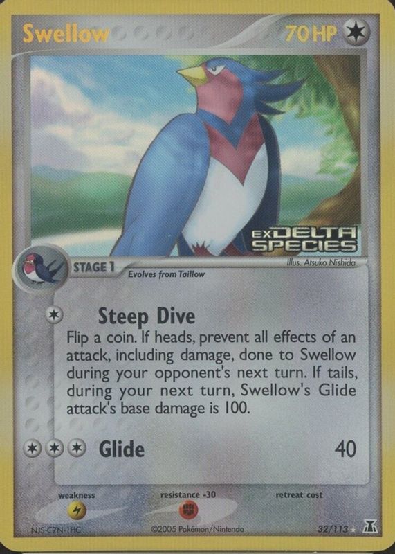 The Swellow 2005 EX: Delta Species #032/113 Reverse Holo card in Raw TCG (Near Mint) condition has moved up $4.24 (+48.5%) in the last 30 days and was last sold for $12.99 .