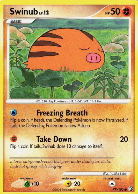 The Swinub 2008 Diamond & Pearl: Stormfront #077/100 Base card in Raw TCG (Near Mint) condition has moved up $1.15 (+84.5%) in the last 30 days and was last sold for $2.50 .