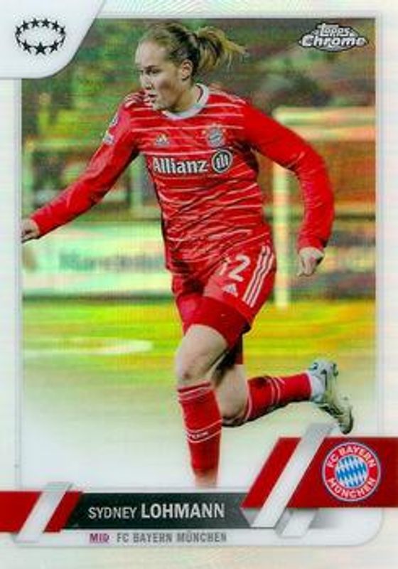 The Sydney Lohmann 2022 Topps Chrome UEFA Women's Champions League #12 Refractor card is 1 of 15 Sydney Lohmann's card variations in the 2022 Topps Chrome UEFA Women's Champions League set being tracked by Sports Card Investor, including Base, Aqua Prism Refractor, Pulsar Refractor, Purple Pulsar Refractor /299, and Blue Mojo Refractor /250.