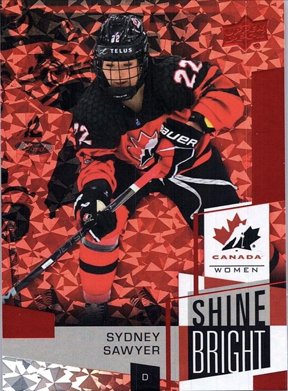 The Sydney Sawyer 2025 Upper Deck Team Canada Juniors #SB-19 Shine Bright - Red card is 1 of 52 Sydney Sawyer's card variations in the 2025 Upper Deck Team Canada Juniors set being tracked by Sports Card Investor, including Base, Blue Patterned Foilboard, Clear Cut, Jersey, and Outburst.