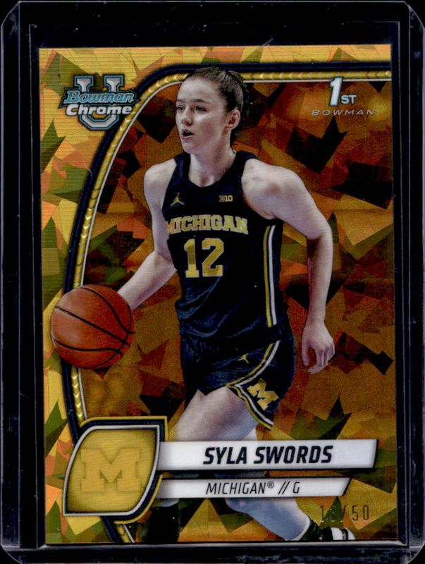 The Syla Swords 2024 Bowman Chrome University Sapphire Edition #65 Gold Refractor /50 card is 1 of 18 Syla Swords' card variations in the 2024 Bowman Chrome University Sapphire Edition set being tracked by Sports Card Investor, including Base, Purple Refractor /100, Yellow Refractor /75, Green Refractor /65, and Orange Refractor /25.