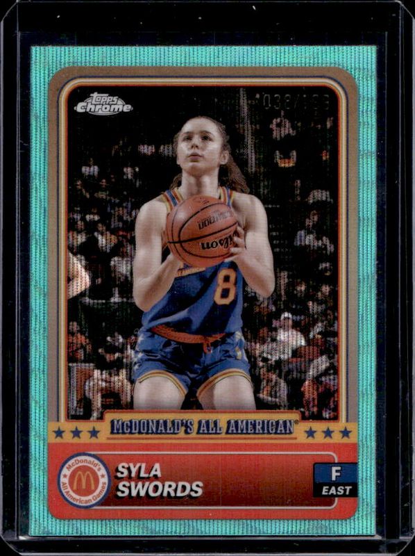 The Syla Swords 2024 Topps Chrome McDonald's All-American #11 Aqua Wave Refractor /199 card is 1 of 102 Syla Swords' card variations in the 2024 Topps Chrome McDonald's All-American set being tracked by Sports Card Investor, including #11 Base, #61 Base, #11 Blue RayWave Refractor, #61 Blue RayWave Refractor, and #11 McDonald's Logo Refractor.