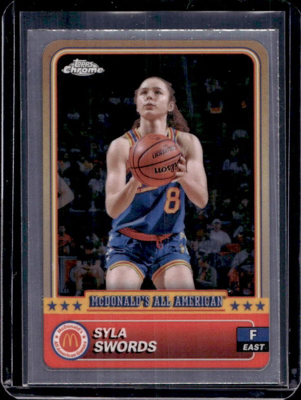 The Syla Swords 2024 Topps Chrome McDonald's All-American #11 Base card is 1 of 102 Syla Swords' card variations in the 2024 Topps Chrome McDonald's All-American set being tracked by Sports Card Investor, including #61 Base, #11 Blue RayWave Refractor, #61 Blue RayWave Refractor, #11 McDonald's Logo Refractor, and #61 McDonald's Logo Refractor.
