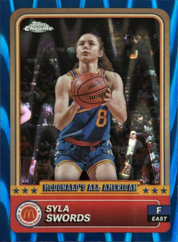 The Syla Swords 2024 Topps Chrome McDonald's All-American #61 Blue RayWave Refractor card is 1 of 102 Syla Swords' card variations in the 2024 Topps Chrome McDonald's All-American set being tracked by Sports Card Investor, including #11 Base, #61 Base, #11 Blue RayWave Refractor, #11 McDonald's Logo Refractor, and #61 McDonald's Logo Refractor.