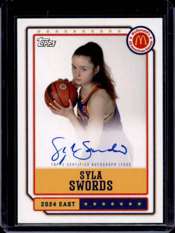 The Syla Swords 2024 Topps Chrome McDonald's All-American #EA-SY Event Autographs card is 1 of 102 Syla Swords' card variations in the 2024 Topps Chrome McDonald's All-American set being tracked by Sports Card Investor, including #11 Base, #61 Base, #11 Blue RayWave Refractor, #61 Blue RayWave Refractor, and #11 McDonald's Logo Refractor.