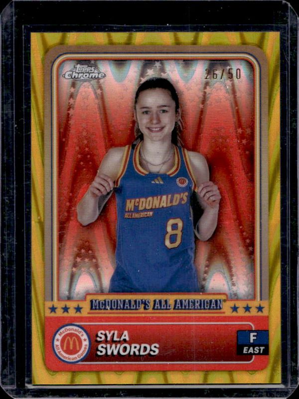 The Syla Swords 2024 Topps Chrome McDonald's All-American #61 Gold RayWave Refractor /50 card is 1 of 102 Syla Swords' card variations in the 2024 Topps Chrome McDonald's All-American set being tracked by Sports Card Investor, including #11 Base, #61 Base, #11 Blue RayWave Refractor, #61 Blue RayWave Refractor, and #11 McDonald's Logo Refractor.