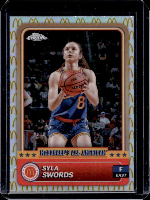 The Syla Swords 2024 Topps Chrome McDonald's All-American #11 McDonald's Logo Refractor card is 1 of 102 Syla Swords' card variations in the 2024 Topps Chrome McDonald's All-American set being tracked by Sports Card Investor, including #11 Base, #61 Base, #11 Blue RayWave Refractor, #61 Blue RayWave Refractor, and #61 McDonald's Logo Refractor.