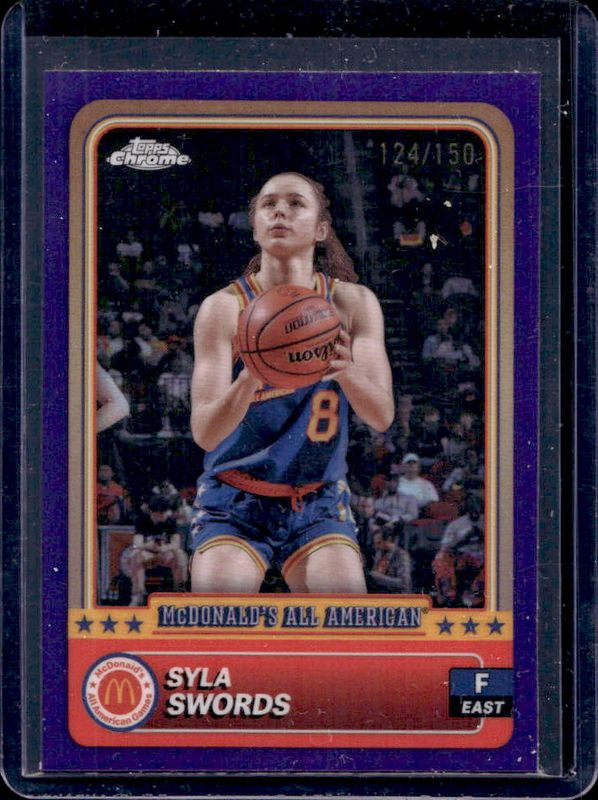 The Syla Swords 2024 Topps Chrome McDonald's All-American #11 Purple Refractor /150 card is 1 of 102 Syla Swords' card variations in the 2024 Topps Chrome McDonald's All-American set being tracked by Sports Card Investor, including #11 Base, #61 Base, #11 Blue RayWave Refractor, #61 Blue RayWave Refractor, and #11 McDonald's Logo Refractor.