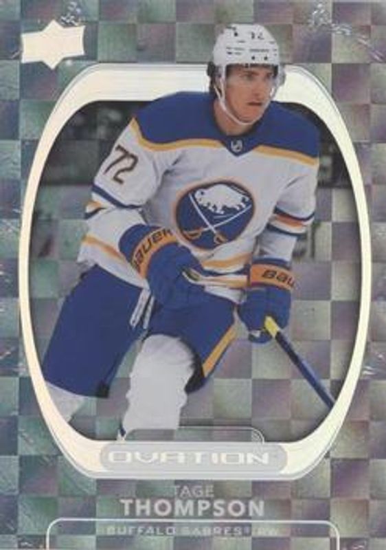 The Tage Thompson 2021 Upper Deck Ovation #39 Checkerboard card is 1 of 13 Tage Thompson's card variations in the 2021 Upper Deck Ovation set being tracked by Sports Card Investor, including Base, Gold Circular Wonder, Gold Foil, Silver Foil, and Standing Ovation /500.