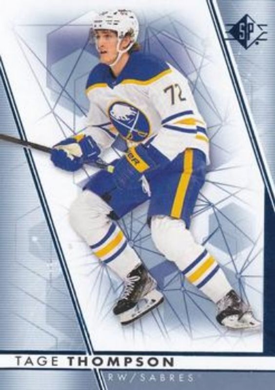 The Tage Thompson 2022 SP #72 Blue card is 1 of 15 Tage Thompson's card variations in the 2022 SP set being tracked by Sports Card Investor, including Base /399, Authentic Profiles - Blue, Authentic Profiles Jersey, Authentic Profiles - Patterned Foilboard, and Authentic Profiles - Patterned Foilboard Gold.