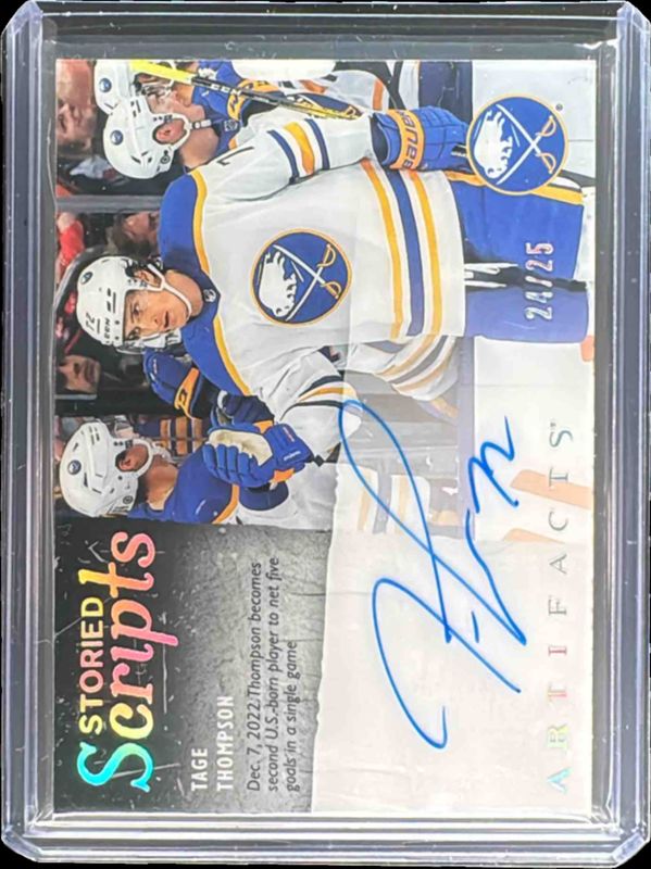 The Tage Thompson 2023 Upper Deck Artifacts #SS-TH Storied Scripts /25 card is 1 of 41 Tage Thompson's card variations in the 2023 Upper Deck Artifacts set being tracked by Sports Card Investor, including Base /999, Leather, Plexi, Turquoise, and Wood.