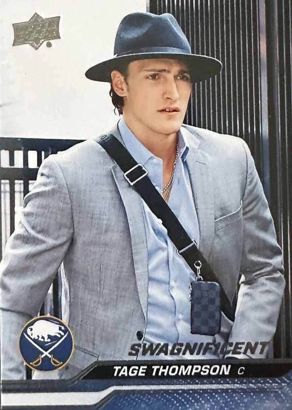 The Tage Thompson 2023 Upper Deck #17 Swagnificent /(SSP) card in Raw condition has not changed in price in the last 30 days and was last sold for $21.00 .