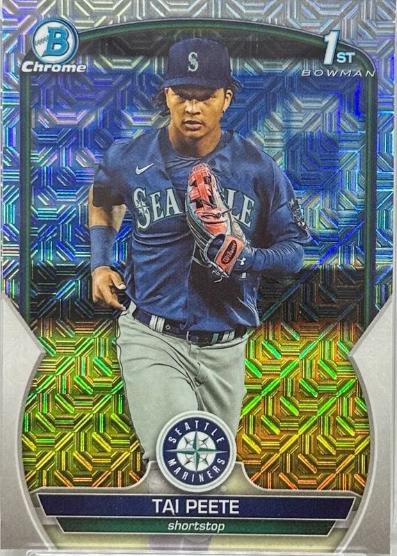 This card is 1 of 43 Tai Peete's card variations in the 2023 Bowman Draft set being tracked by Sports Card Investor, including Chrome (1st), Chrome - Lunar Glow Refractor (1st), Chrome - Pearl Refractor (1st), Chrome - Refractor (1st), and Chrome - Sky Blue Refractor (1st).