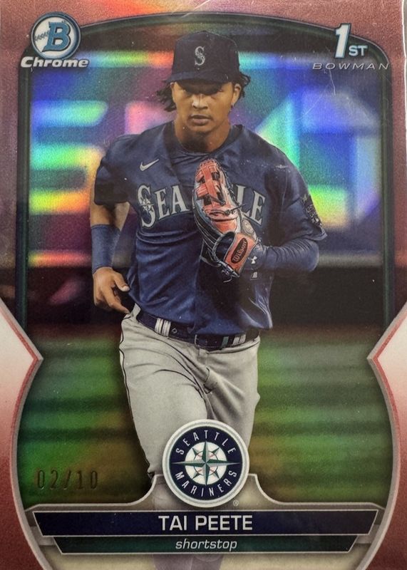 The Tai Peete 2023 Bowman Draft #BDC-28 Chrome - Rose Gold Refractor /10 (1st) card in Raw condition has not changed in price in the last 30 days and was last sold for $52.79 .