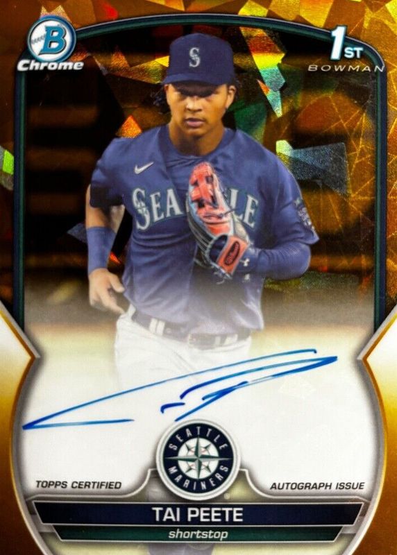 The Tai Peete 2023 Bowman Draft Sapphire Edition #CDA-TP Chrome Prospect Auto - Gold /50 (1st) card in Raw condition has not changed in price in the last 30 days and was last sold for $42.00 .