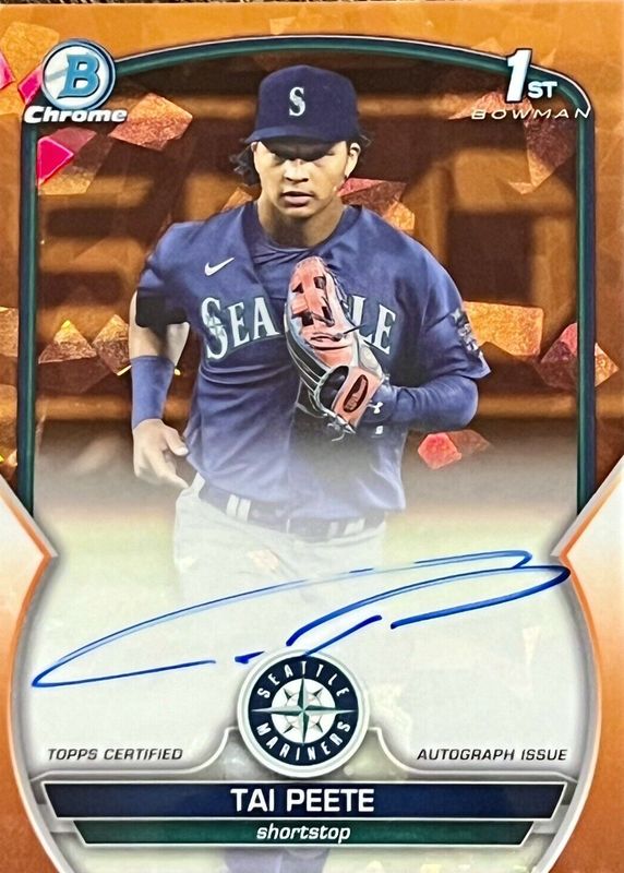 The Tai Peete 2023 Bowman Draft Sapphire Edition #CDA-TP Chrome Prospect Auto - Orange /25 (1st) card in Raw condition has not changed in price in the last 30 days and was last sold for $177.50 .