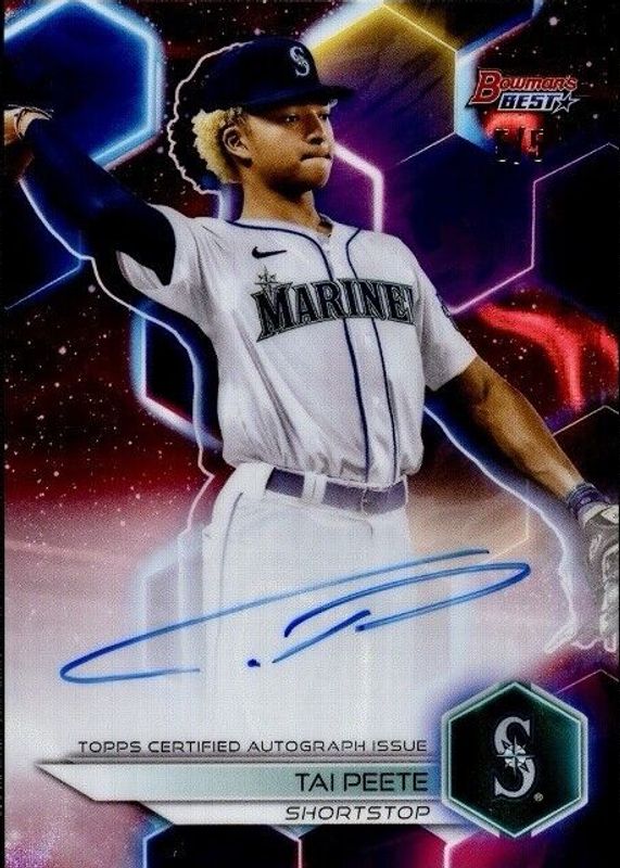 This card is 1 of 10 Tai Peete's card variations in the 2023 Bowman's Best set being tracked by Sports Card Investor, including Best of 2023 Autographs, Best of 2023 Autographs - Refractor, Best of 2023 Autographs - Blue Refractor /150, Best of 2023 Autographs - Green Refractor /99, and Best of 2023 Autographs - Gold Lava Refractor /75.