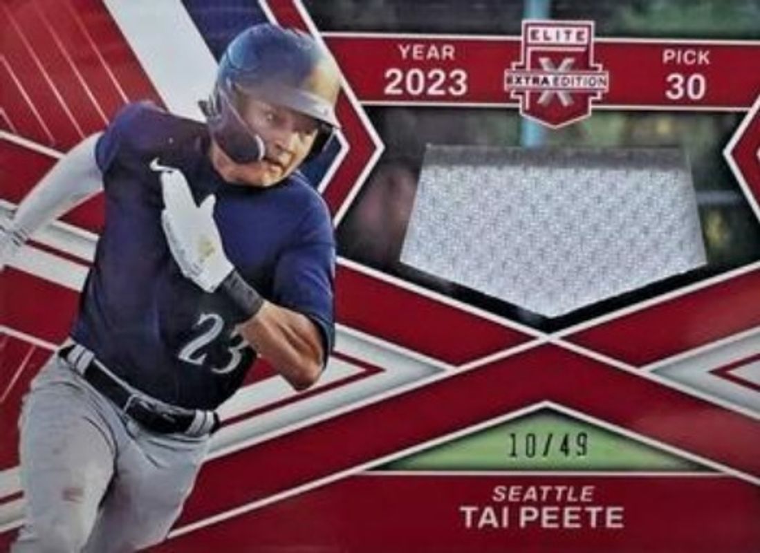 The Tai Peete 2023 Elite Extra Edition #FR-TPT First Round Materials - Red /49 card is 1 of 77 Tai Peete's card variations in the 2023 Elite Extra Edition set being tracked by Sports Card Investor, including Base, Pink, Signatures, Status Green /499, and Signatures die-cut /399.