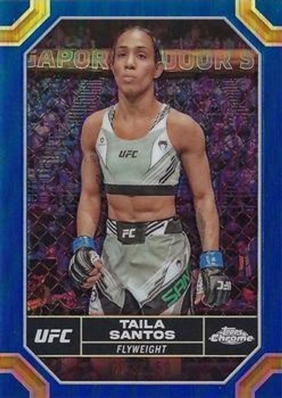 The Taila Santos 2024 Topps Chrome UFC #184 Blue Refractor /150 card is 1 of 25 Taila Santos' card variations in the 2024 Topps Chrome UFC set being tracked by Sports Card Investor, including Base, Magenta Refractor, Negative Refractor, Prism Refractor, and Purple Refractor.