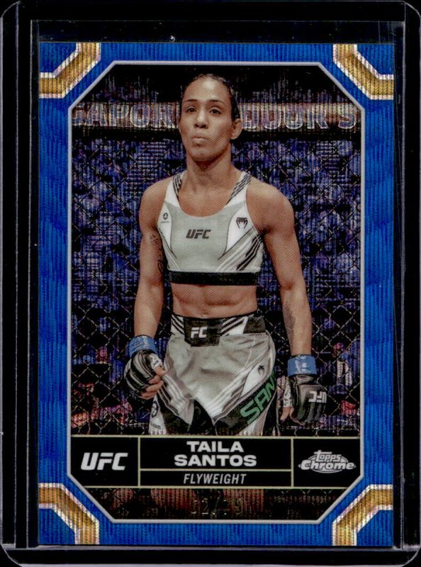 The Taila Santos 2024 Topps Chrome UFC #184 Blue Wave Refractor /75 card is 1 of 25 Taila Santos' card variations in the 2024 Topps Chrome UFC set being tracked by Sports Card Investor, including Base, Magenta Refractor, Negative Refractor, Prism Refractor, and Purple Refractor.
