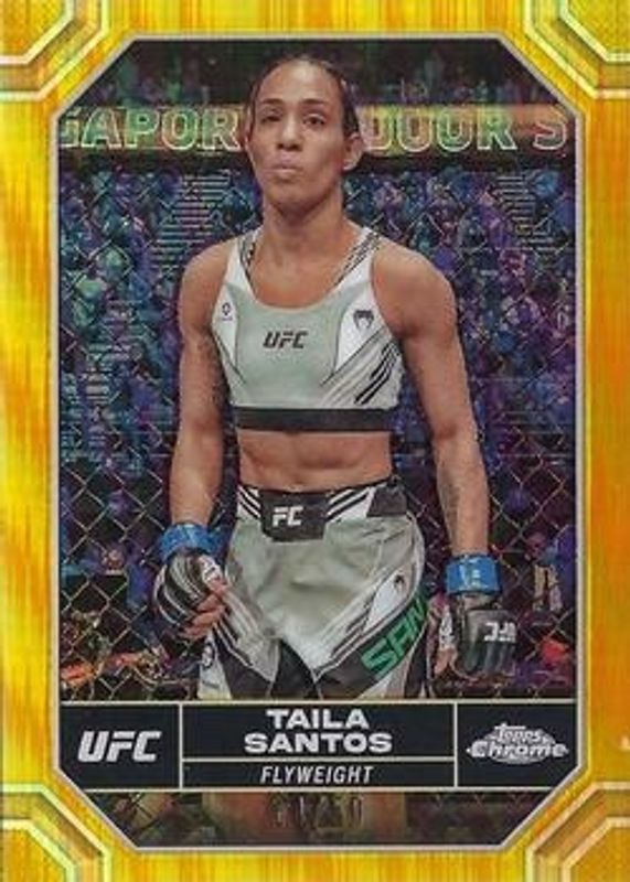 The Taila Santos 2024 Topps Chrome UFC #184 Gold Refractor /50 card is 1 of 25 Taila Santos' card variations in the 2024 Topps Chrome UFC set being tracked by Sports Card Investor, including Base, Magenta Refractor, Negative Refractor, Prism Refractor, and Purple Refractor.