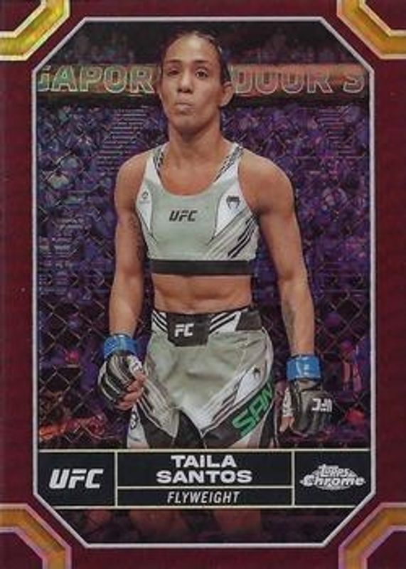 The Taila Santos 2024 Topps Chrome UFC #184 Magenta Refractor card is 1 of 25 Taila Santos' card variations in the 2024 Topps Chrome UFC set being tracked by Sports Card Investor, including Base, Negative Refractor, Prism Refractor, Purple Refractor, and Refractor.