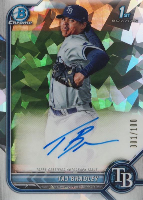 This card is 1 of 16 Taj Bradley's card variations in the 2022 Bowman set being tracked by Sports Card Investor, including Chrome Prospect Auto (1st), Chrome Prospect Auto - Refractor /499 (1st), Chrome Prospect Auto - Speckle Refractor /299 (1st), Chrome Prospect Auto - Purple Refractor /250 (1st), and Chrome Prospect Auto - Blue Refractor /150 (1st).