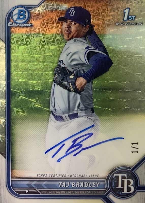 This card is 1 of 16 Taj Bradley's card variations in the 2022 Bowman set being tracked by Sports Card Investor, including Chrome Prospect Auto (1st), Chrome Prospect Auto - Refractor /499 (1st), Chrome Prospect Auto - Speckle Refractor /299 (1st), Chrome Prospect Auto - Purple Refractor /250 (1st), and Chrome Prospect Auto - Blue Refractor /150 (1st).