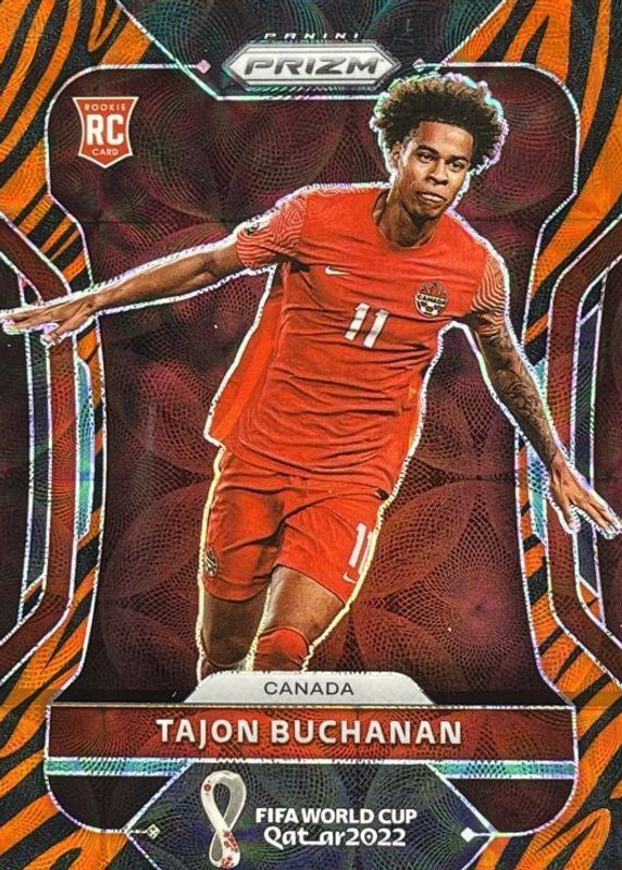 The Tajon Buchanan 2022 Prizm World Cup #54 Choice Tiger Stripe /(SSP) Rookie card in Raw condition has not changed in price in the last 30 days and was last sold for $75.00 .
