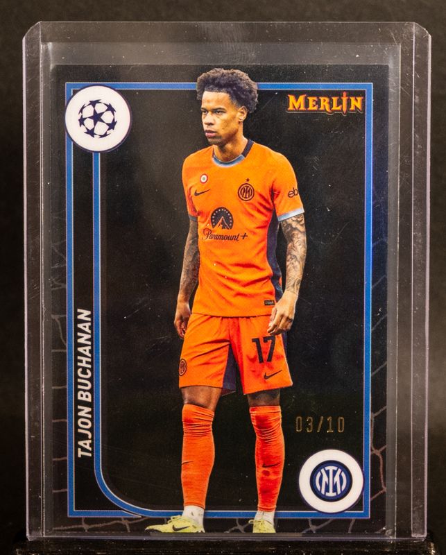 The Tajon Buchanan 2023 Topps Merlin Chrome UEFA Club Competitions #110 Black Refractor /10 card is 1 of 25 Tajon Buchanan's card variations in the 2023 Topps Merlin Chrome UEFA Club Competitions set being tracked by Sports Card Investor, including Base, Aqua Prism Refractor, Refractor, Vintage Merlin Refractor, and Neon Green Shimmer Refractor /399.