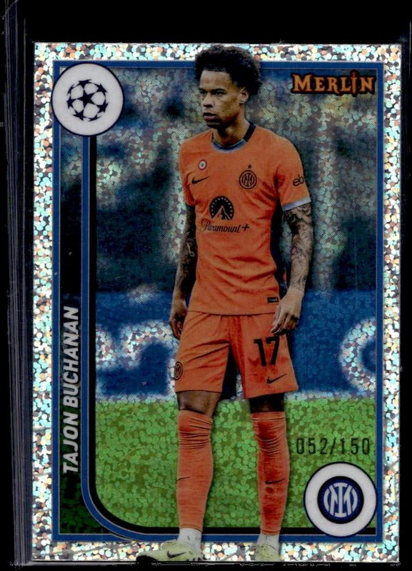 The Tajon Buchanan 2023 Topps Merlin Chrome UEFA Club Competitions #110 Speckle Refractor /150 card is 1 of 25 Tajon Buchanan's card variations in the 2023 Topps Merlin Chrome UEFA Club Competitions set being tracked by Sports Card Investor, including Base, Aqua Prism Refractor, Refractor, Vintage Merlin Refractor, and Neon Green Shimmer Refractor /399.