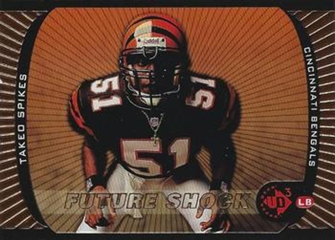 The Takeo Spikes 1998 Upper Deck UD3 #11 Base Rookie card is 1 of 6 Takeo Spikes' card variations in the 1998 Upper Deck UD3 set being tracked by Sports Card Investor, including #101 Base, #191 Base, #101 Die-Cut /2000, #11 Die-Cut /2000, and #191 Die-Cut /2000.