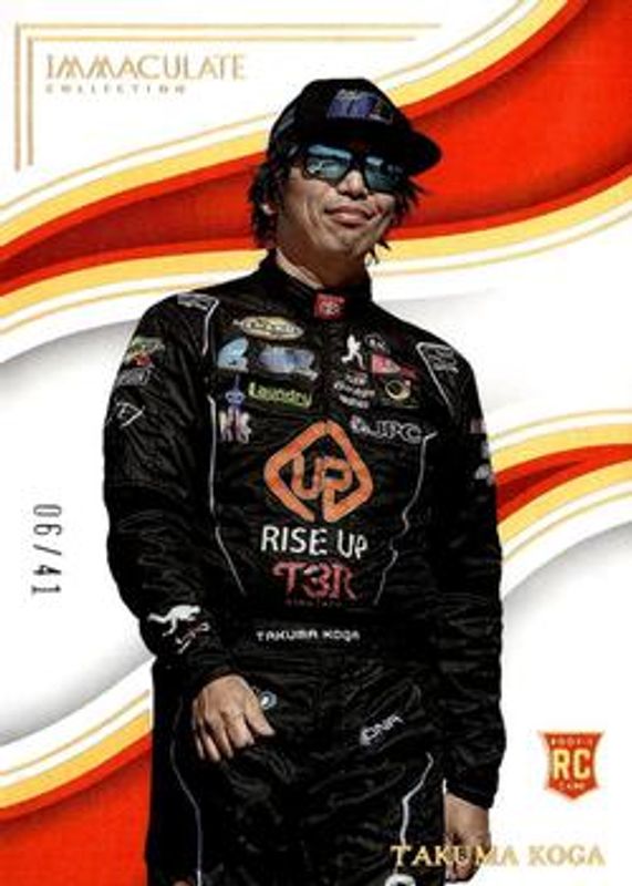 The Takuma Koga 2023 Chronicles NASCAR #49 Immaculate - Holo Gold /89 Rookie card is 1 of 95 Takuma Koga's card variations in the 2023 Chronicles NASCAR set being tracked by Sports Card Investor, including Clearly Donruss, Mosaic, Mosaic Autographs, Mosaic - Carolina Blue, and Mosaic - Green.