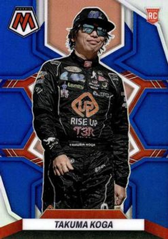 The Takuma Koga 2023 Chronicles NASCAR #3 Mosaic - Blue /199 Rookie card is 1 of 95 Takuma Koga's card variations in the 2023 Chronicles NASCAR set being tracked by Sports Card Investor, including Clearly Donruss, Mosaic, Mosaic Autographs, Mosaic - Carolina Blue, and Mosaic - Green.