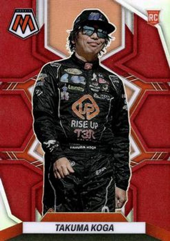 The Takuma Koga 2023 Chronicles NASCAR #3 Mosaic - Red /99 Rookie card is 1 of 95 Takuma Koga's card variations in the 2023 Chronicles NASCAR set being tracked by Sports Card Investor, including Clearly Donruss, Mosaic, Mosaic Autographs, Mosaic - Carolina Blue, and Mosaic - Green.