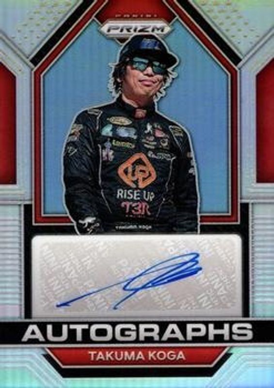 The Takuma Koga 2023 Prizm NASCAR #A-TKO Autographs Rookie card is 1 of 27 Takuma Koga's card variations in the 2023 Prizm NASCAR set being tracked by Sports Card Investor, including Base, Hyper Blue & Carolina Blue, Hyper Purple & Yellow, Reactive Orange, and Red.