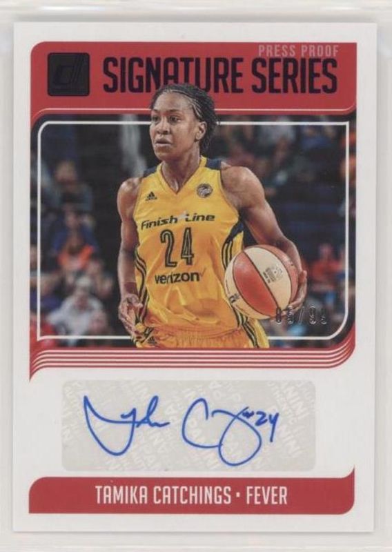 The Tamika Catchings 2019 Donruss WNBA #SS-TCG Signatures Series - Press Proof Purple /99 card is 1 of 10 Tamika Catchings' card variations in the 2019 Donruss WNBA set being tracked by Sports Card Investor, including Retro Series, Signatures Series, Retro Series - Press Proof /199, Signatures Series - Press Proof /199, and Retro Series - Press Proof Purple /99.