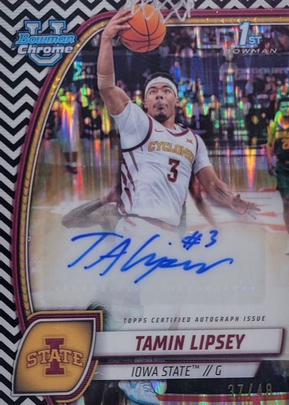 This card is 1 of 19 Tamin Lipsey's card variations in the 2024 Bowman Chrome University set being tracked by Sports Card Investor, including Prospect Auto (1st), Prospect Auto - Black Wave Refractor (1st), Prospect Auto - Green Shimmer Refractor (1st), Prospect Auto - Refractor (1st), and Prospect Auto - Stealth Refractor (1st).
