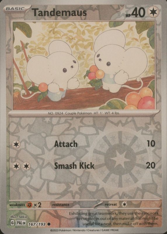 This card is 1 of 5 Tandemaus' card variations in the 2023 Scarlet & Violet: Paldea Evolved set being tracked by Sports Card Investor, including #166/193 Base, #167/193 Cosmos Holo - Adventure Chest Exclusive, #166/193 Reverse Holo, and #167/193 Reverse Holo.